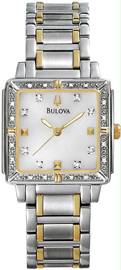 Brushed and polished two tone stainless steel square case measures 26mm diameter by 7mm thick. Comfortable link bracelet includes a push button deployment clasp, perfect for securing the watch about your wrist. Mother of Pearl dial with gold tone luminous hands. Eight genuine diamond hour markers , along with all the diamonds set in the bezel, make this already stunning watch into an absolute masterpiece. A scratch resistant mineral crystal protects the water resistant case. The precise Quartz movement rests within the fine timepiece.