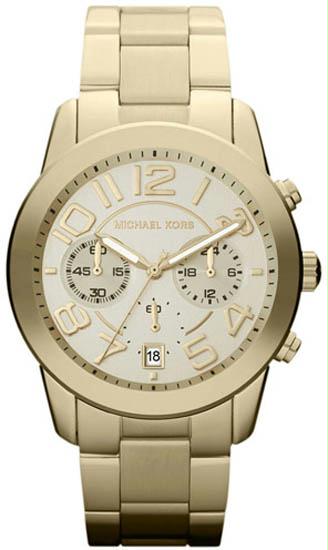 A Unique and Stylish Timepiece from Michael Kors. Gold tone stainless steel case measures 42mm wide by 13mm thick and water resistant 100m. Chronograph feature with 3 sub-dials. Comfortable stainless steel link bracelet with a fold over push deployment clasp. Clear date display at the sixth hour. Champagne tone dial has gold tone hands and hour markers. Scratch resistant mineral crystal. Precise Quartz movement.